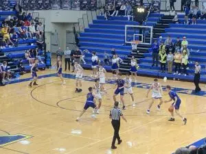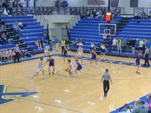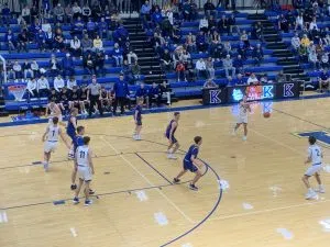 Into the third quarter Kearney appeared to put the game away scoring 18 and holding the Bulldogs to 14. Kearney only added triples in the third: one from Lee, two from Dahlgren, two added by Ian Piper off the bench, and Johnson adding one. North Platte’s scoring machine River Johnston came alive, scoring seven of his nineteen points in the quarter. Despite the Johnston heroics, Kearney led 52-33.