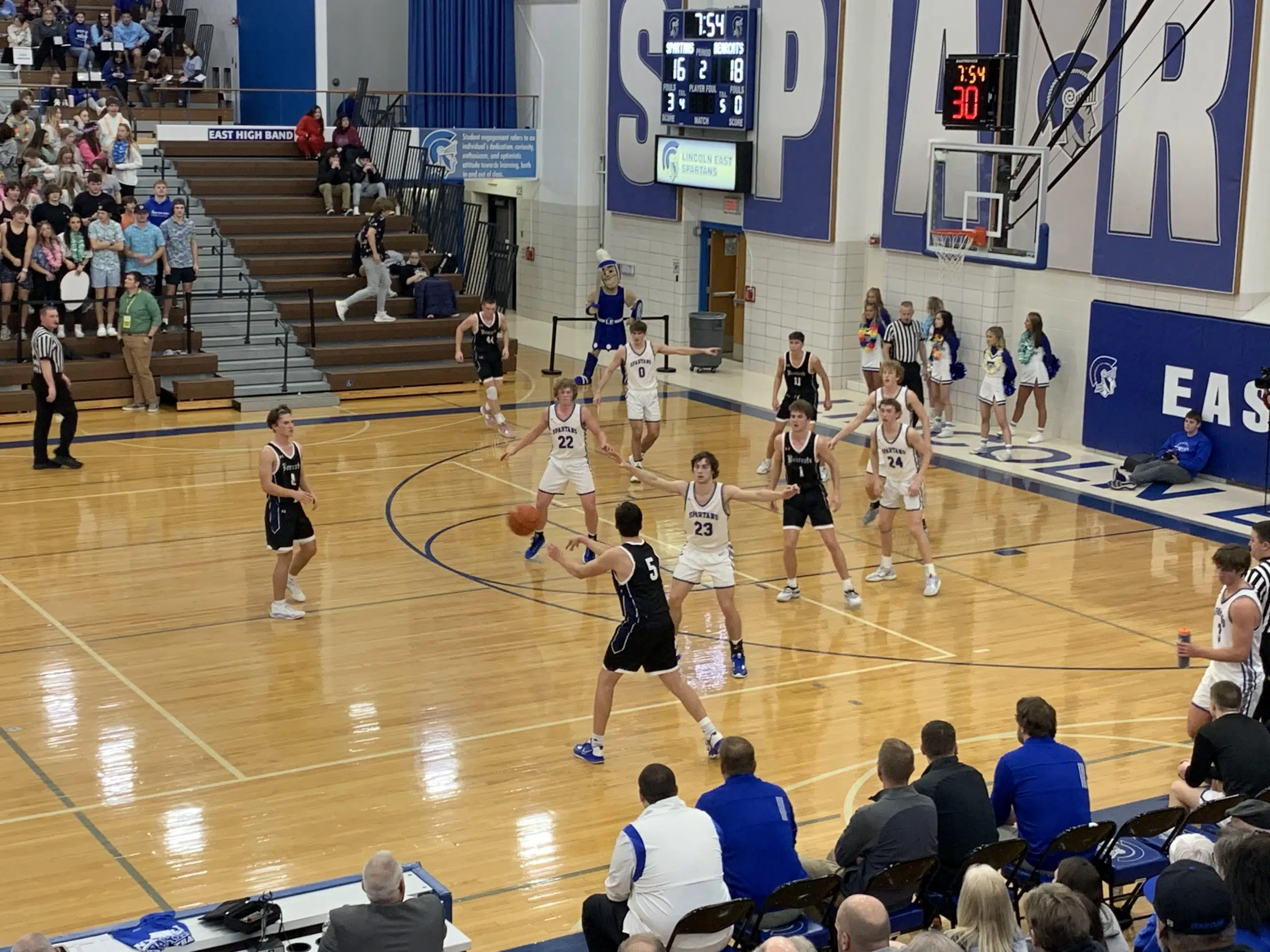 Thursday’s contest opened up with a bang, as stellar defensive plays were snuffed out early and created more scoring early as Kearney and East traded blow for blow in the opening minutes. Kearney’s Asher Endorf blocked or deflected several attempts, but the Spartans followed through multiple times by Carter Mick’s high energy performance dropping nine points in the opening quarter. Mick and Kearney’s Ben Johnson appeared to be a scoring dual, as the sophomore lined up a three pointer early. Jack Dahlgren also connected from three to earn six points in the quarter. In the back-and-forth first quarter, Treyven Beckman’s three near the end of the first aided Kearney in taking a slight 18-16 advantage heading into the second.