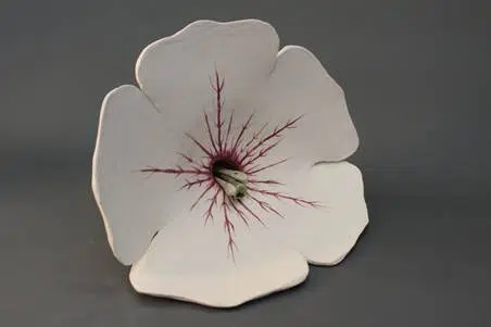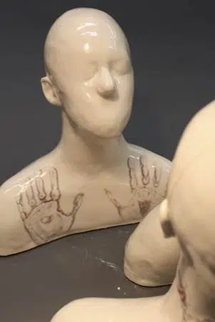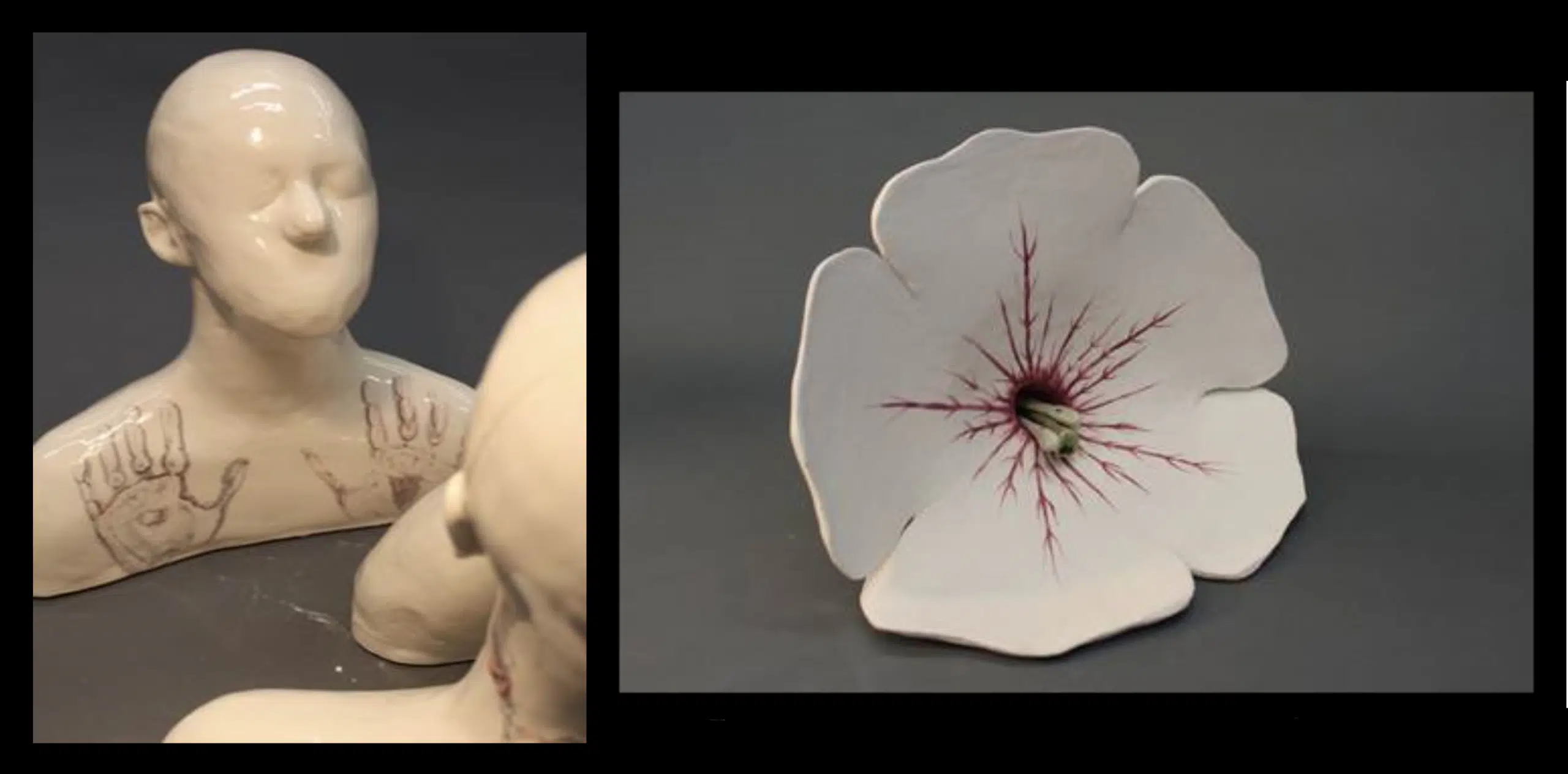 Mapes’ artwork is a ceramic flower titled ‘Demeter.’  Buck’s selected piece is a ceramic bust entitled, ‘Not my fault’.