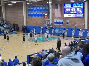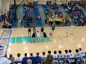 Sandwiched between plays, senior Justin Murray for Kearney was fouled from behind on a rebound attempt, then knocked down one free throw and missed the second. On the miss, an offensive rebound by Johnson misfired, but Murray nabbed another board, awaited contact, and elevated for a score and foul putting Kearney right back into the game late.