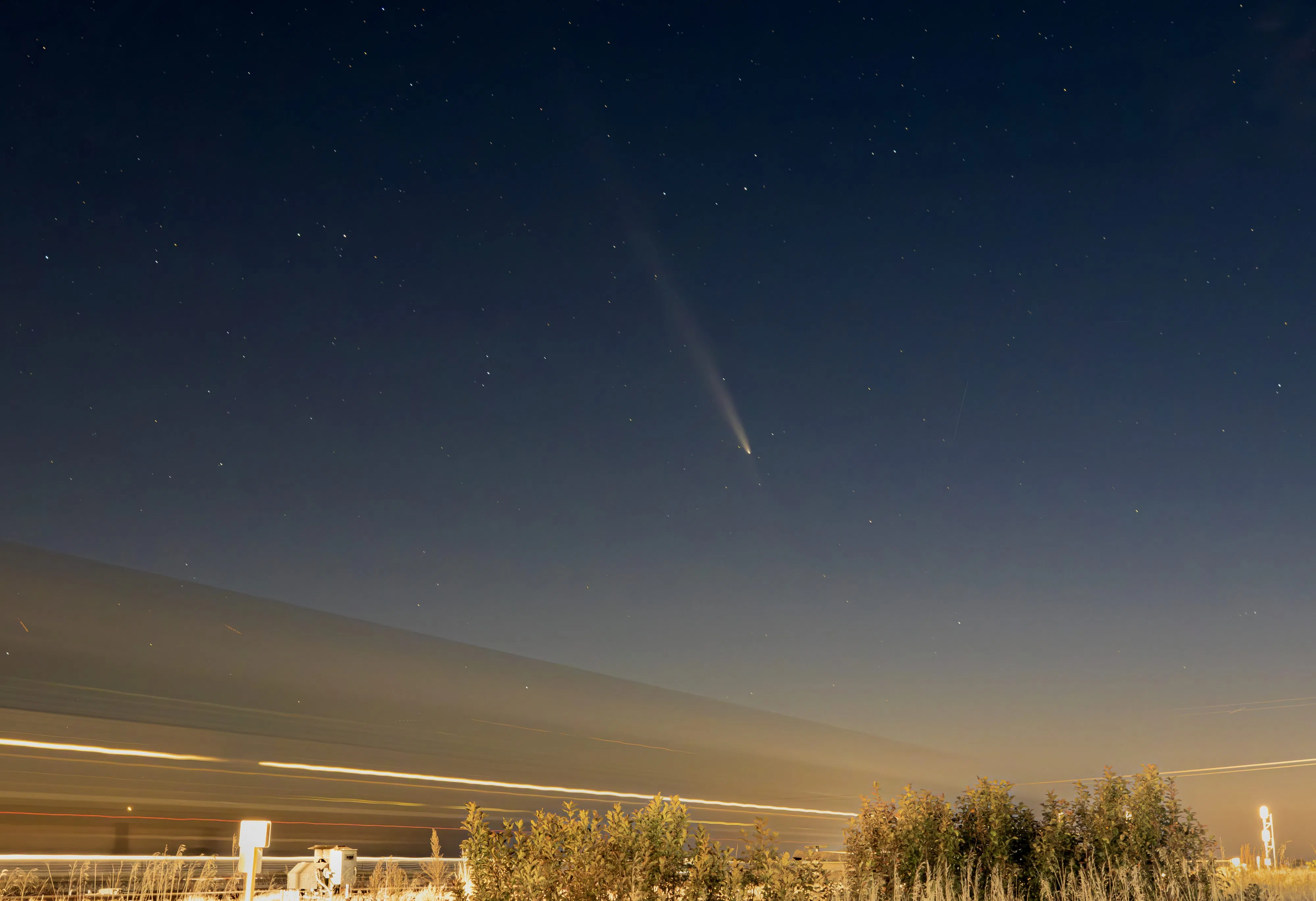 Comet C/2023 A3 (Tsuchinshan-ATLAS) with a passing train in the foreground, 10-15-24