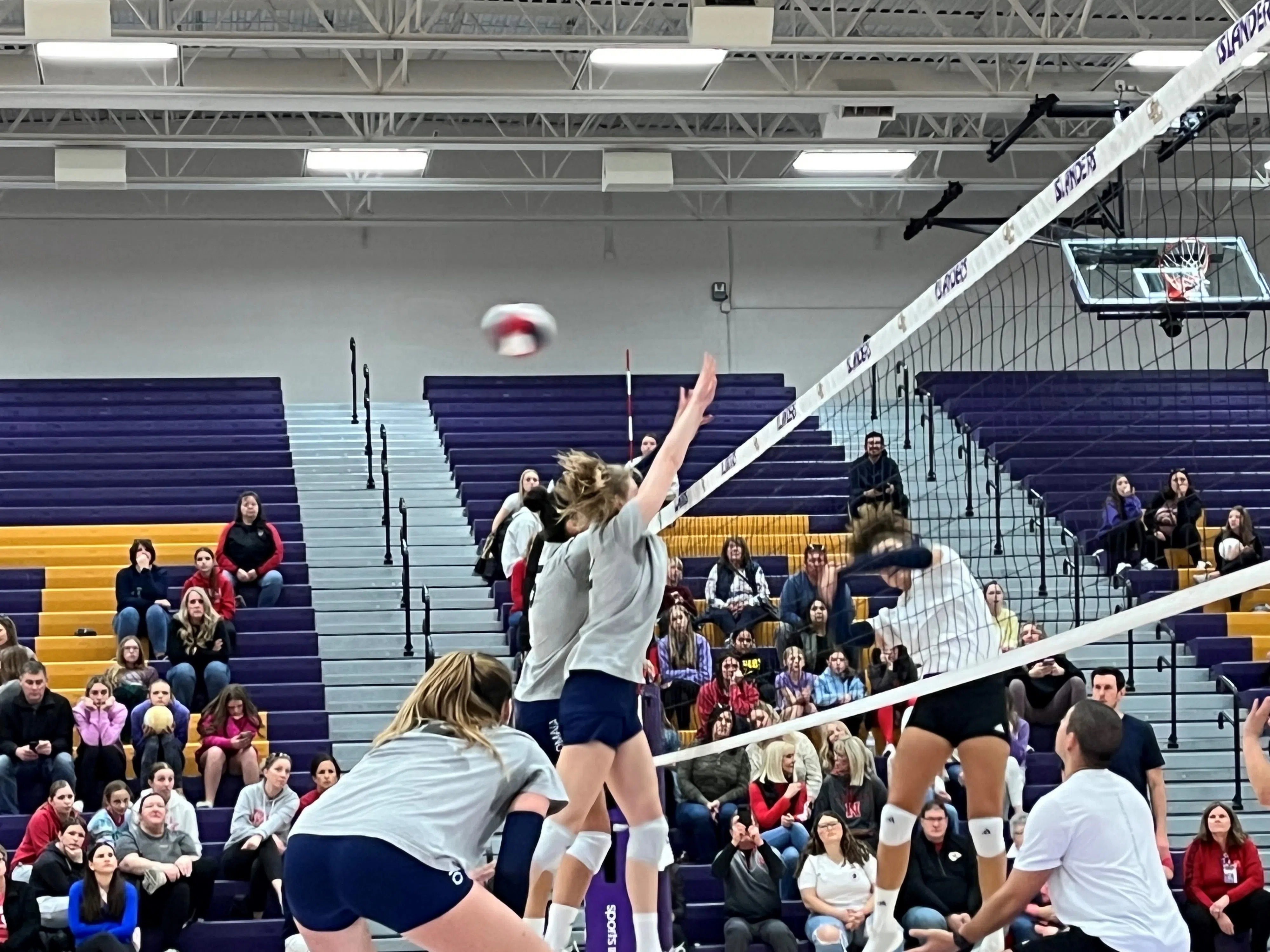 A volleyball is spiked over two blockers at the volleyball scrimmage Dec. 7 in Grand Island, (Carol Bryant, Central Nebraska Today)