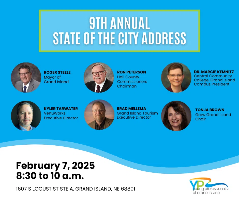 GRAND ISLAND — The Grand Island Chamber of Commerce’s Young Professionals program is hosting the 9th annual State of the City Address Fri., Feb. 7, 2025 from 8:30 to 10 a.m. at Venues on South Locust (1607 S Locust Street, Suite A, Grand Island, NE 68801).