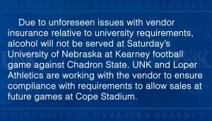 UNK announced today on their social media pages that alcohol will not be served at tomorrow’s home opener against Chadron State.