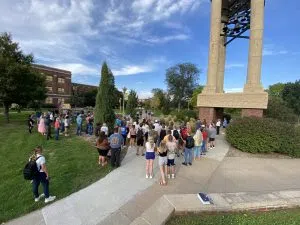People gather around the UNK bell tower Thursday during a vigil in remembrance of Turning Point USA founder Charlie Kirk. / Alex Hammeke, CentralNebraskaTODAY.com