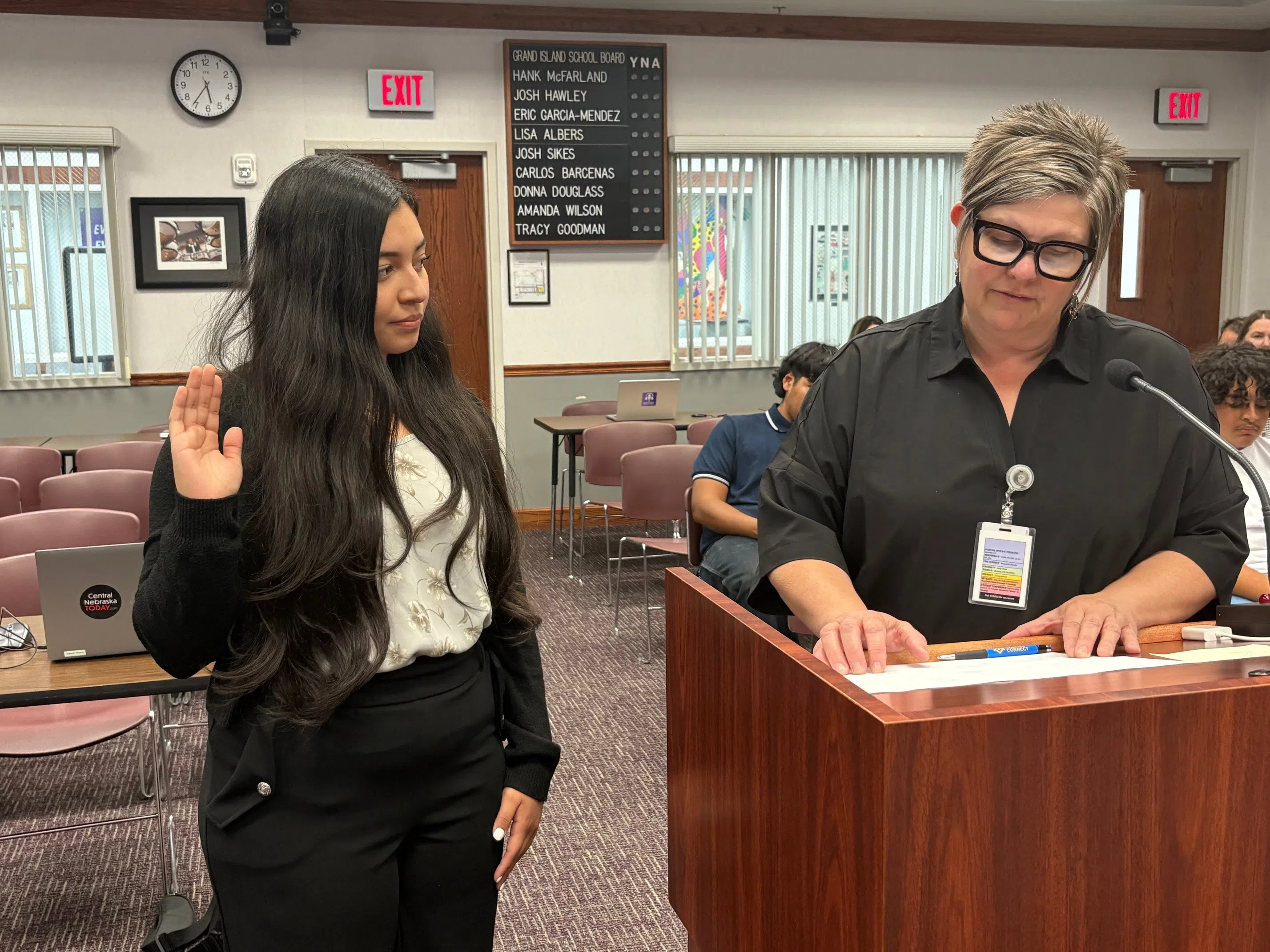 Katherin Xicara takes the oath of office given by Associate Superintendent Dr. Summer Stephens as the new student representative on the Grand Island Public Schools Board of Education. This occurred at the Sept. 11 Board of Education meeting, (Carol Bryant, Central Nebraska Today)