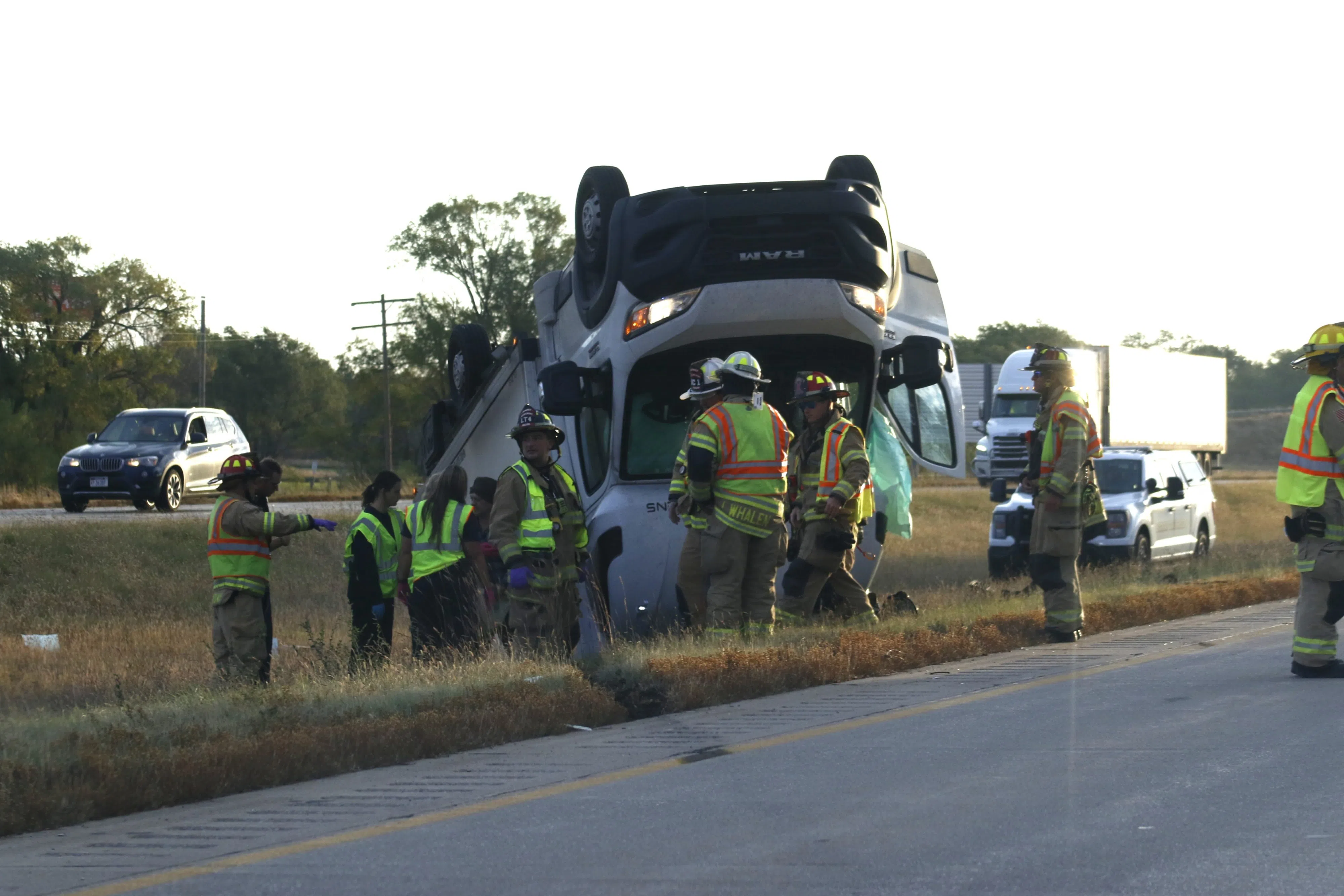 On scene, a white Dodge Ram cargo van came to a rest on its roof in the median of Interstate 80.