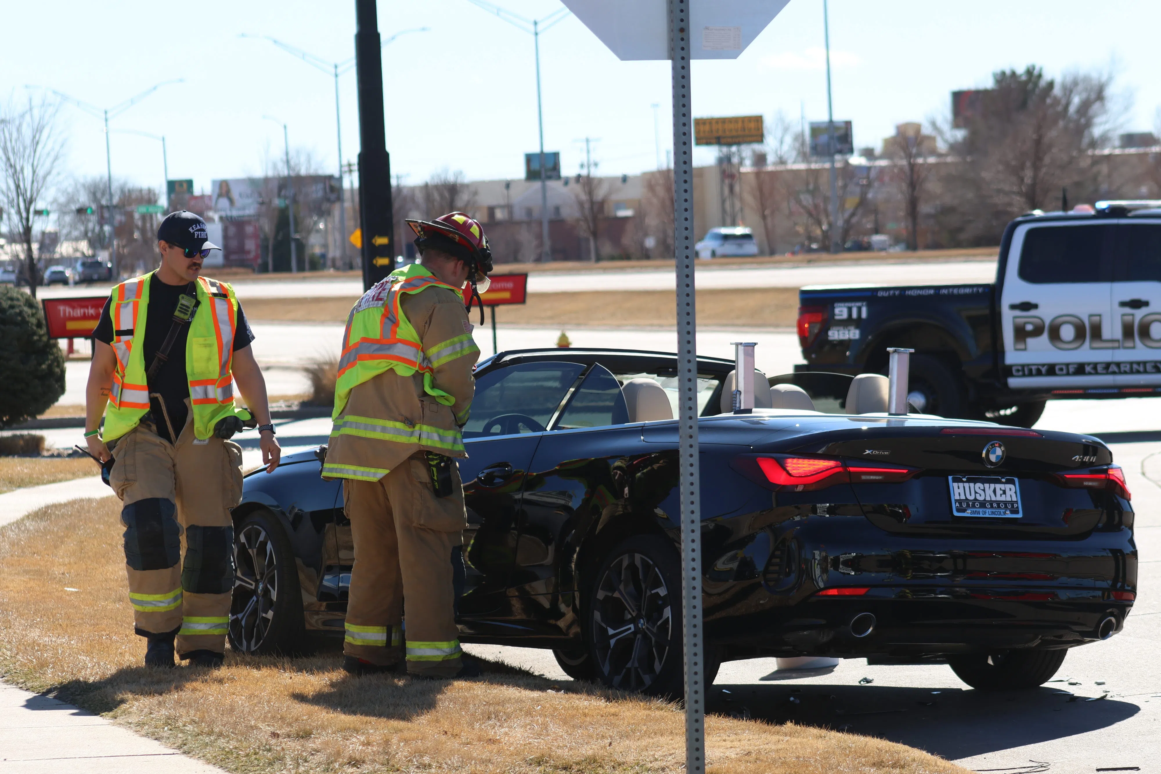 Kearney firefighters inspect a BMW convertible that was involved in the three vehicle accident, (Brian Neben, Central Nebraska Today)