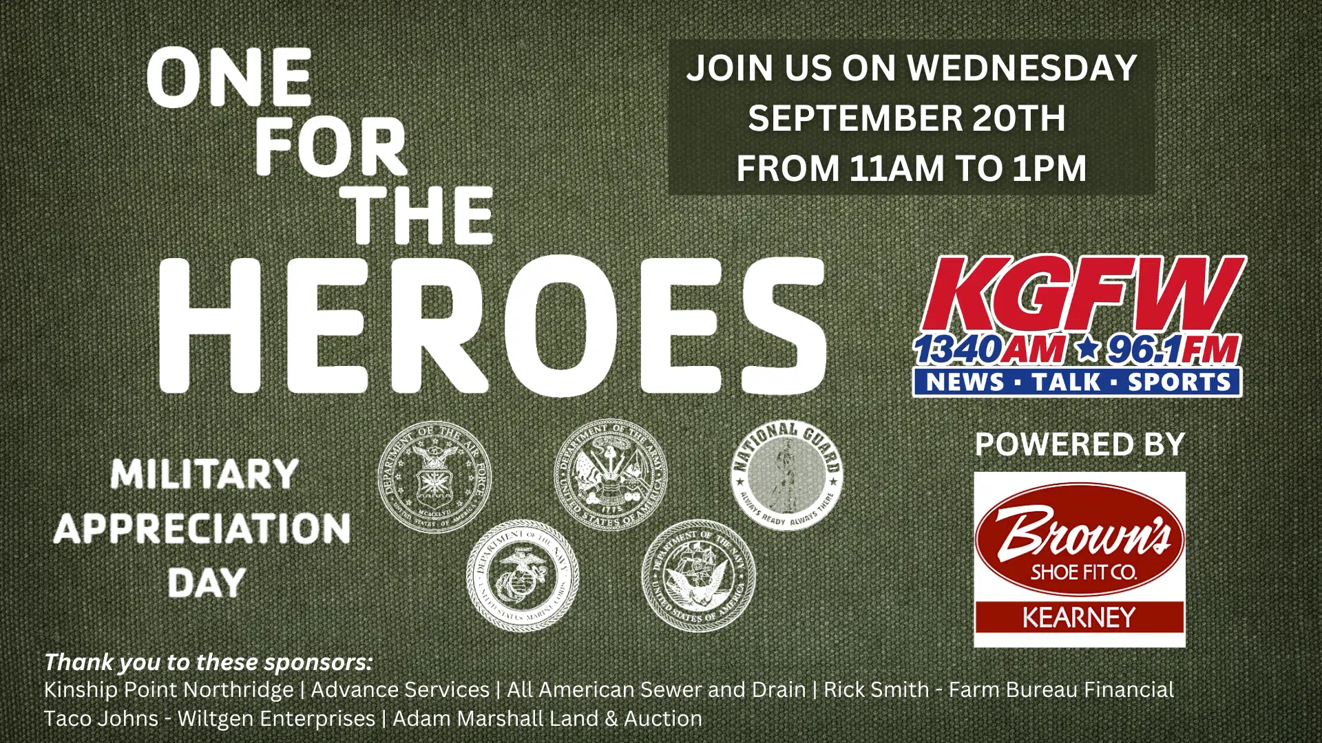 Wednesday, September 17th is KGFW and Brown’s Shoe Fit of Kearney ONE FOR THE HEROES DAY.