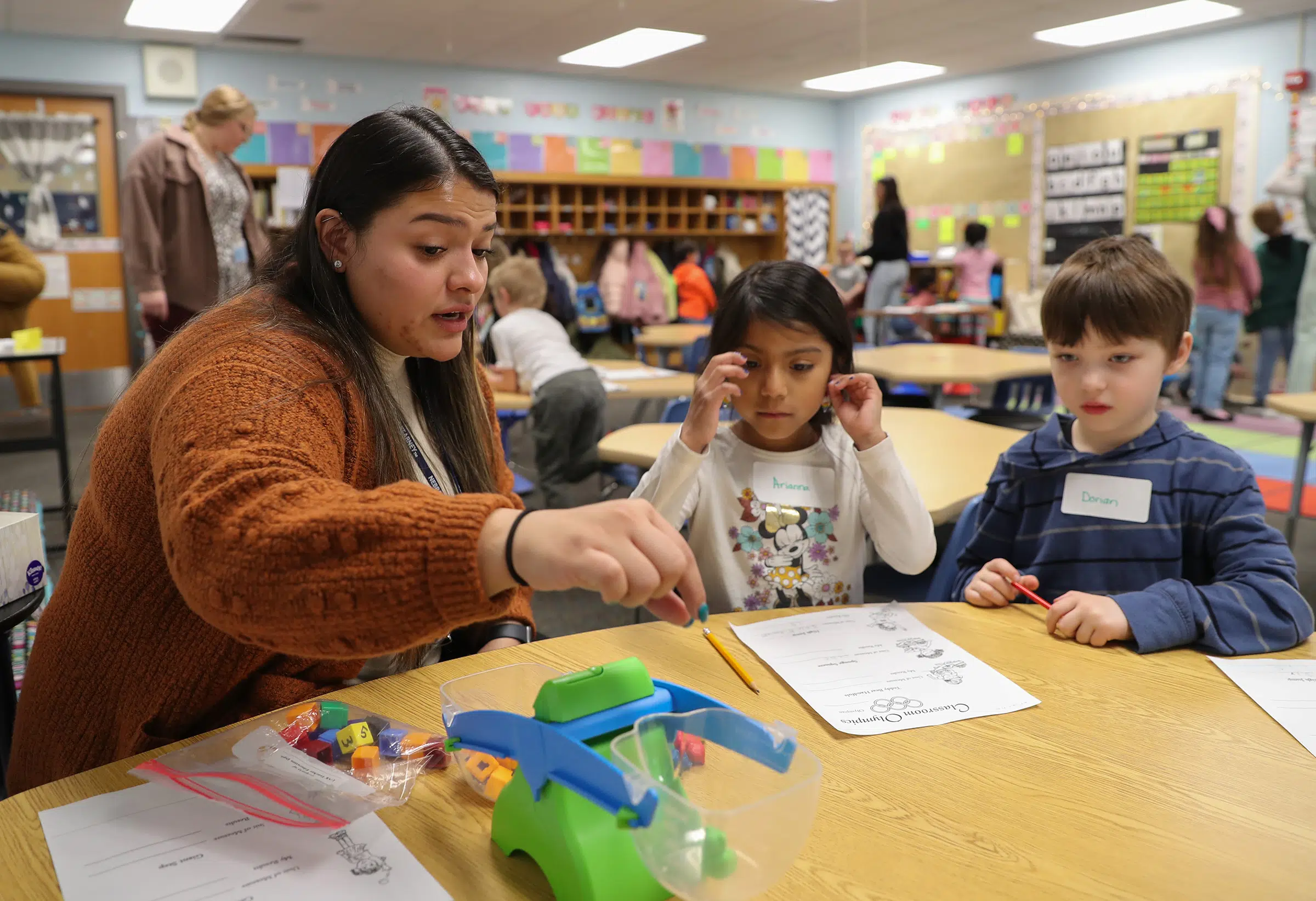 Tyler Ellyson UNK News Mar 10, 2023 UNK teacher education student Tessa Eldridge leads an activity Thursday during the Measurement Olympics at Emerson Elementary School in Kearney. (Photo by Erika Pritchard, UNK Communications)
