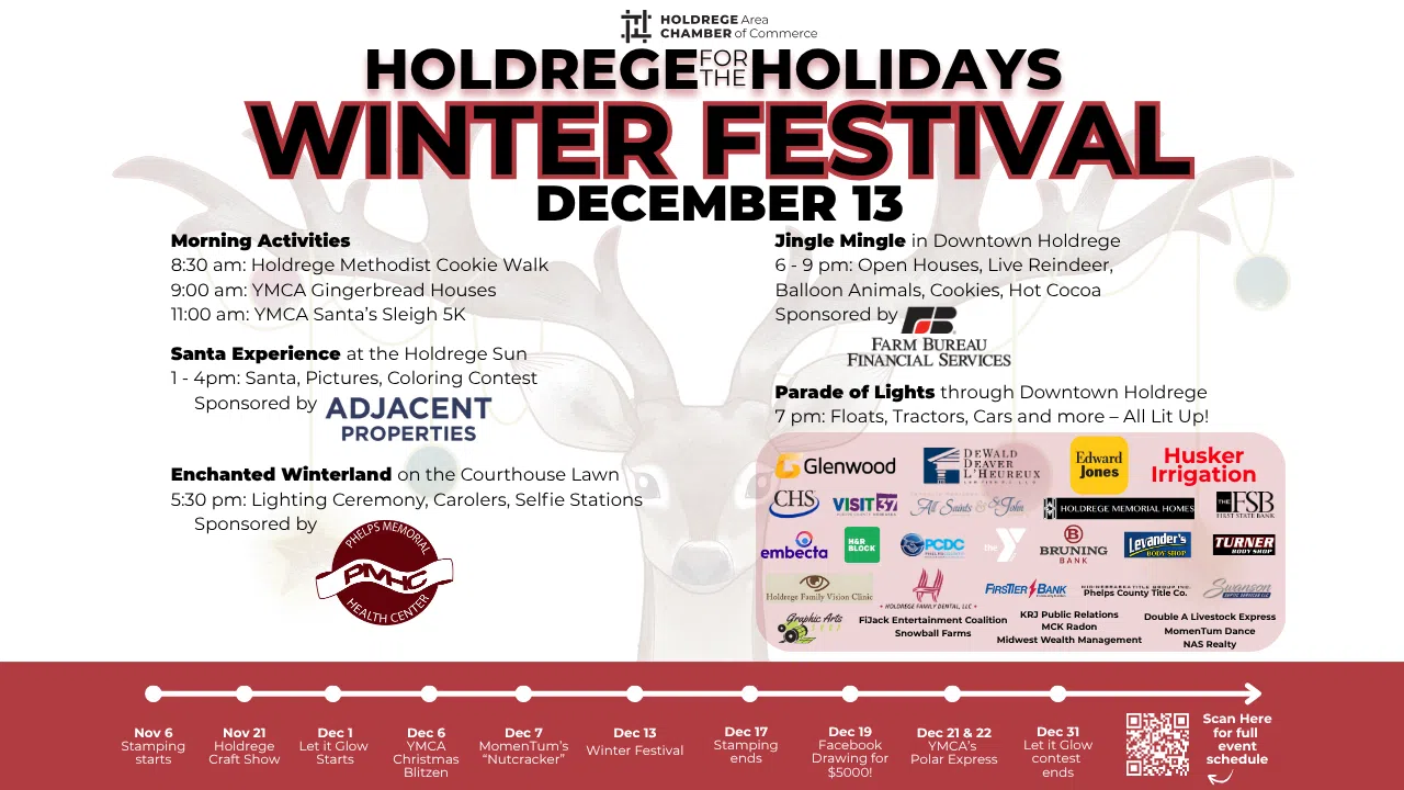 HOLDREGE - The Holdrege Area Chamber of Commerce invites the public to celebrate the season at Winterfest, returning to downtown Holdrege on Friday, Dec. 13. This full-day celebration brings families, neighbors, and visitors together for a lineup of free, family-friendly activities that highlight the best of the holida...